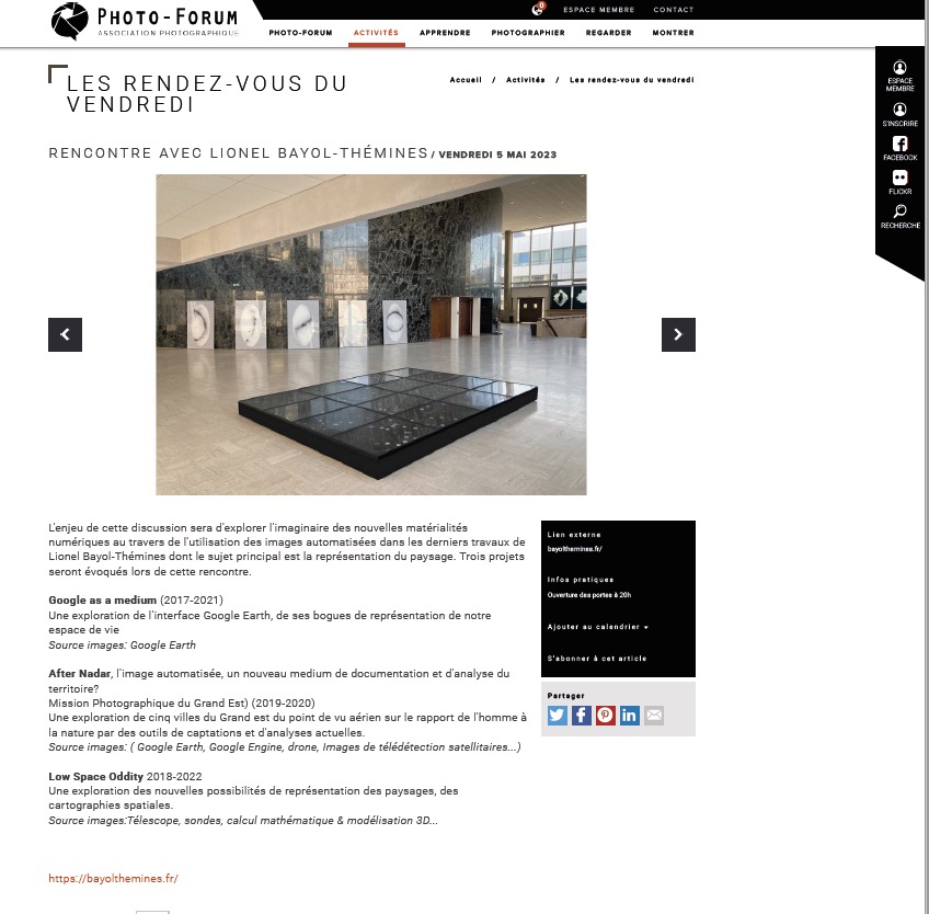 Foto Forum Vendredi 5 mai 2023 20H30 https://www.photo-forum.fr/fr/les-rendez-vous-du-vendredi/rencontre-avec-lionel-bayol-themines_-d.html Partager : Cliquez pour partager sur Facebook(ouvre dans une nouvelle fenêtre) Facebook Cliquez pour partager sur LinkedIn(ouvre dans une nouvelle fenêtre) LinkedIn Cliquez pour partager sur Tumblr(ouvre dans une nouvelle fenêtre) Tumblr Cliquer pour partager sur X(ouvre dans une nouvelle fenêtre) X Cliquez pour partager sur Pinterest(ouvre dans une nouvelle fenêtre) Pinterest J’aime chargement…