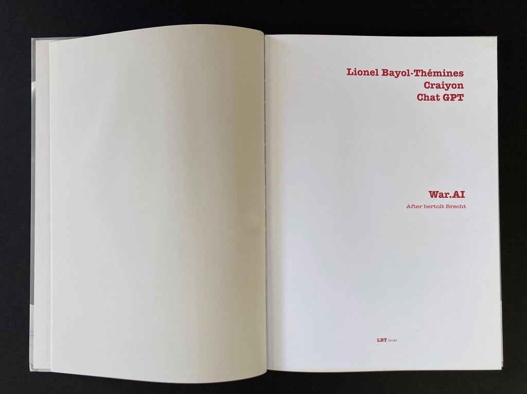 Cette édition de tête, restitution de la performance War . AI a été imprimé à 25 exemplaires par Lionel Bayol-Thémines. Elle est composée de 92 pages, de 80 photographies et légendes imprimées sur papier couché mat 170 g sous couverture rigide, reliure cousue de format 30,3 x 21,5 X 1,3 cm