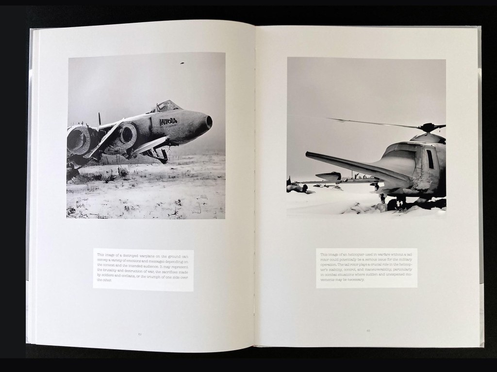 This book is thought of as an experience following the book “ABC de la guerre by Bertolt Brecht“. It is the result of a collaborative performance with a neural network, to which the same sentence was continuously submitted for several consecutive days. One or two variables have been added to the standard sentence in order to vary the images generated. Several hundred images were thus generated, of which a selection of 80 images was retained for this book.Secondly, chat GPT was asked to generate an image caption from its description.