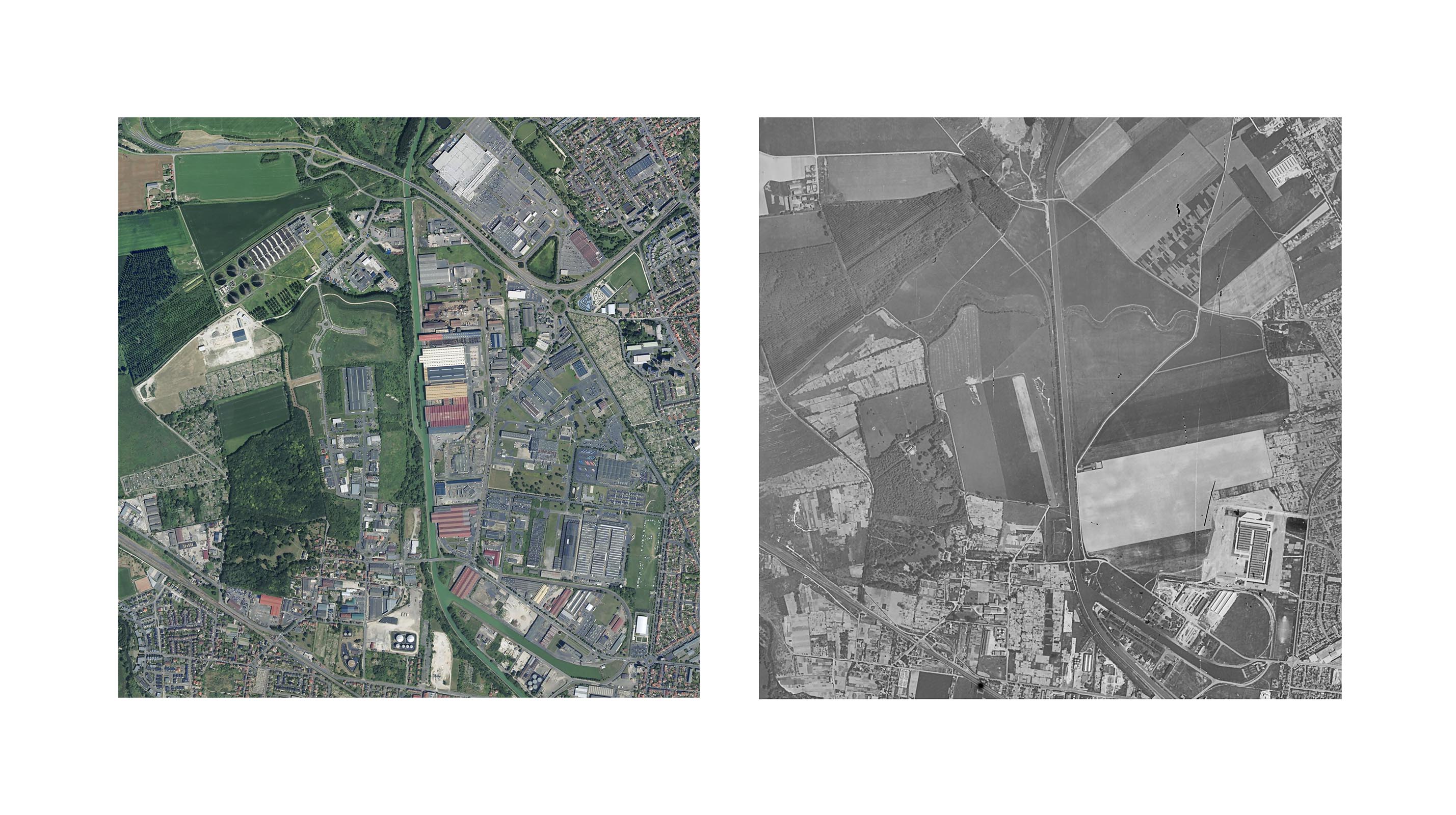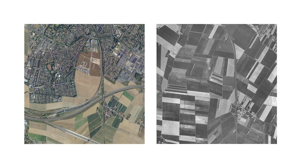 Le projet After Nadar rend hommage dans son nom au premier photographe à avoir réalisé des prises de vues aériennes en ballon au 19ème siècle, ouvrant de nouvelles perspectives dans la représentation du paysage et la cartographie. Lionel Bayol-Thémines utilise les outils de son temps et confronte des images prélevées dans Google Earth à des photographies prises par drone à des modélisations 3D et à des images de surveillance et d’analyse de la terre produites par le laboratoire d’imagerie satellite SERTIT (Illkirch, 67). Avec ce travail de recherche à la fois pictural et scientifique, il souhaite rendre compte de la représentation d’un territoire à l’ère contemporaine et de l’évolution du rapport Homme/Nature. Il explore ces paysages recomposés par une intelligence artificielle et agit tel un iconographe d’une photothèque virtuelle et évolutive. C’est une expérience sur la nature même du médium photographique et la matérialité de ces nouvelles images. Les différentes représentations ainsi mises en résonance exposent l’évolution de cinq zones géographiques centrées sur cinq métropoles du Grand Est. En adoptant ce point de vue aérien, quasi omniscient, le spectateur voyage dans l’espace mais aussi dans le temps et assiste au développement urbain et, conséquemment, à la transformation des espaces naturels aux abords des villes. Dans le présent fugace accessible en ligne comme dans les archives habituellement réservées aux spécialistes, l’occupation du territoire par l’homme révèle son rapport ambivalent à la nature et l’expansion de la démographie, de l’économie, des transports… dans le Grand Est.