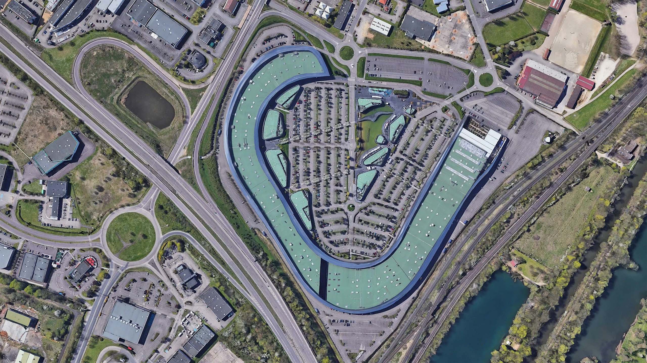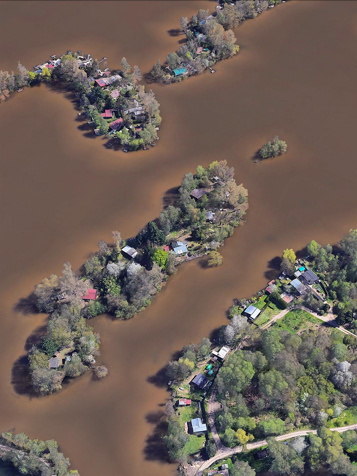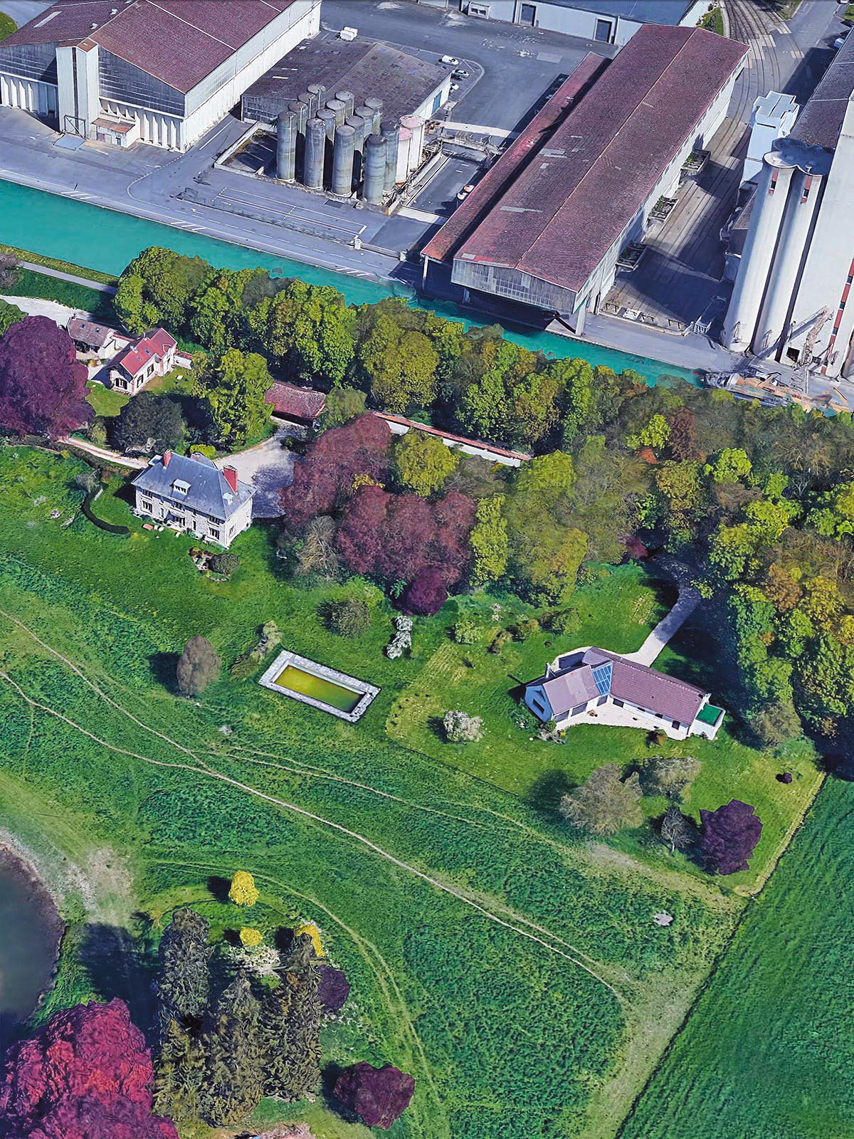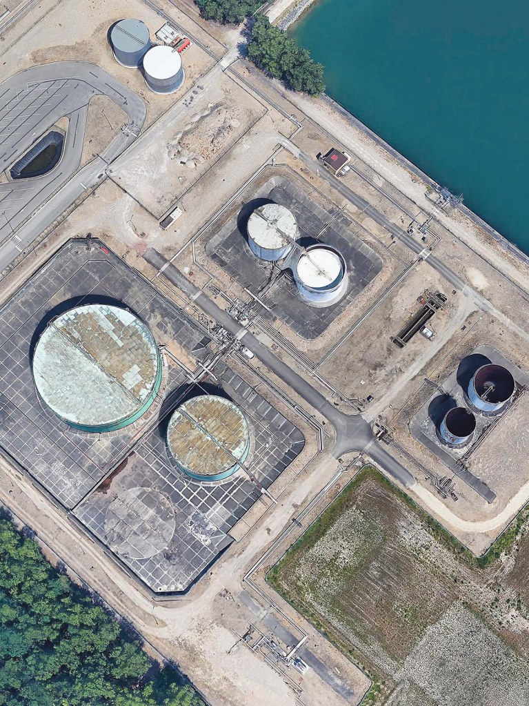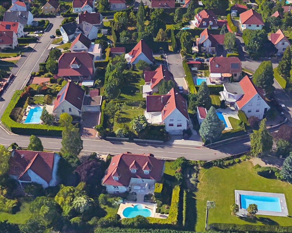 Quel peut être l’apport de ces vues aériennes et de leur modélisation 3D ? Sur le sujet des pourtours de la ville, on peut rapprocher les travaux de Bayol-Thémines de la série Marges (2007-08) de Patrizia Di Fiore qui porte sur les zones pavillonnaires ou commerciales autour des villes de Haute-Normandie (2). Comme d’autres photographes de plain-pied, Di Fiore semble avoir recherché l’image emblématique de la frontière entre la ville et la campagne et l’avoir trouvée dans un principe de composition qui présente, au premier plan, un champ labouré et, au second, un lotissement. Comme Di Fiore a aussi varié les points de vue, sa série est riche d’informations et la confrontation emblématique cède la place à une analyse de ces espaces en marges. Mais le regard fragmentaire interdit une perception plus globale des interactions entre le bâti et son environnement. C’est alors que la vue aérienne impose sa valeur documentaire. En témoigne une capture d’écran réalisée sur Google Earth par Bayol-Thémines autour de Mulhouse. Le cadrage choisi permet une analyse fine de l’interpénétration complexe des espaces et des fonctions qu’une approche de plain-pied ne pourrait démêler. On y voit notamment un quartier résidentiel, dont le niveau social plutôt élevé des habitants est indiqué par le nombre de piscines, venir se loger entre une zone industrielle et des voies de transport. De la même manière, une vue souligne l’étonnant voisinage du port aux pétroles de Strabsourg et du château de Pourtalès installé dans son parc boisé. À chaque fois, les vues obliques très plongeantes permettent de combiner perception volumétrique du paysage et compréhension cartographique de son organisation.