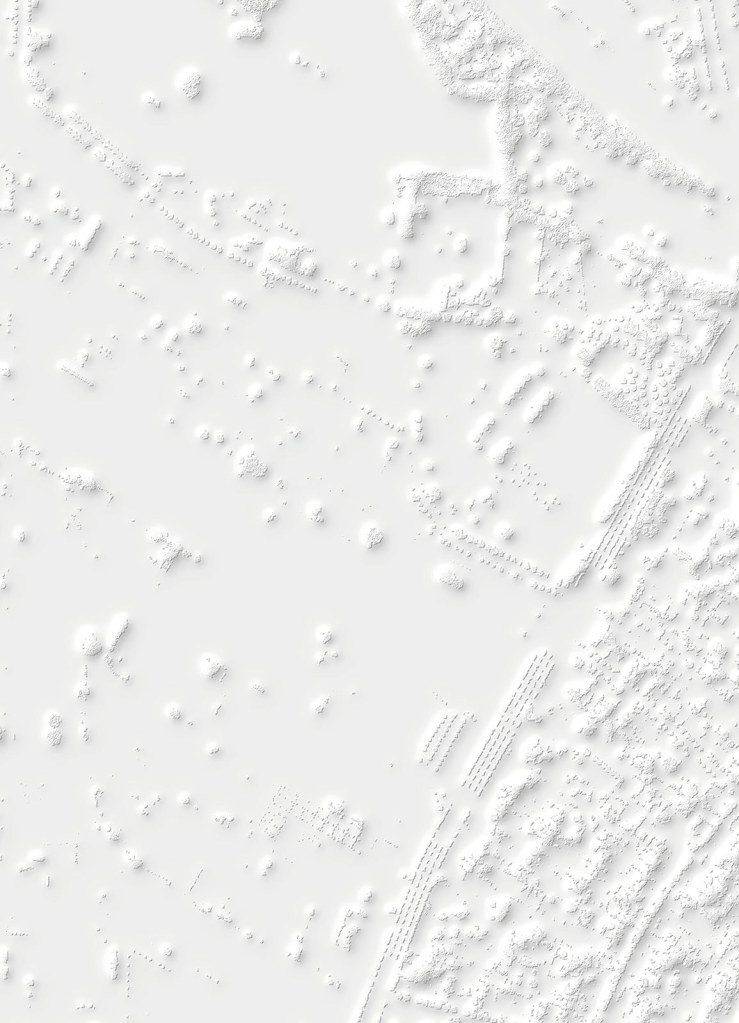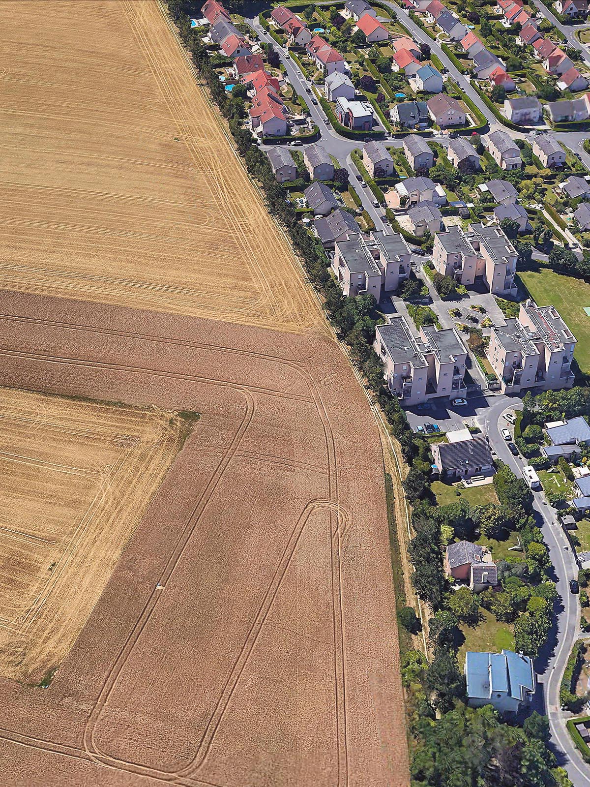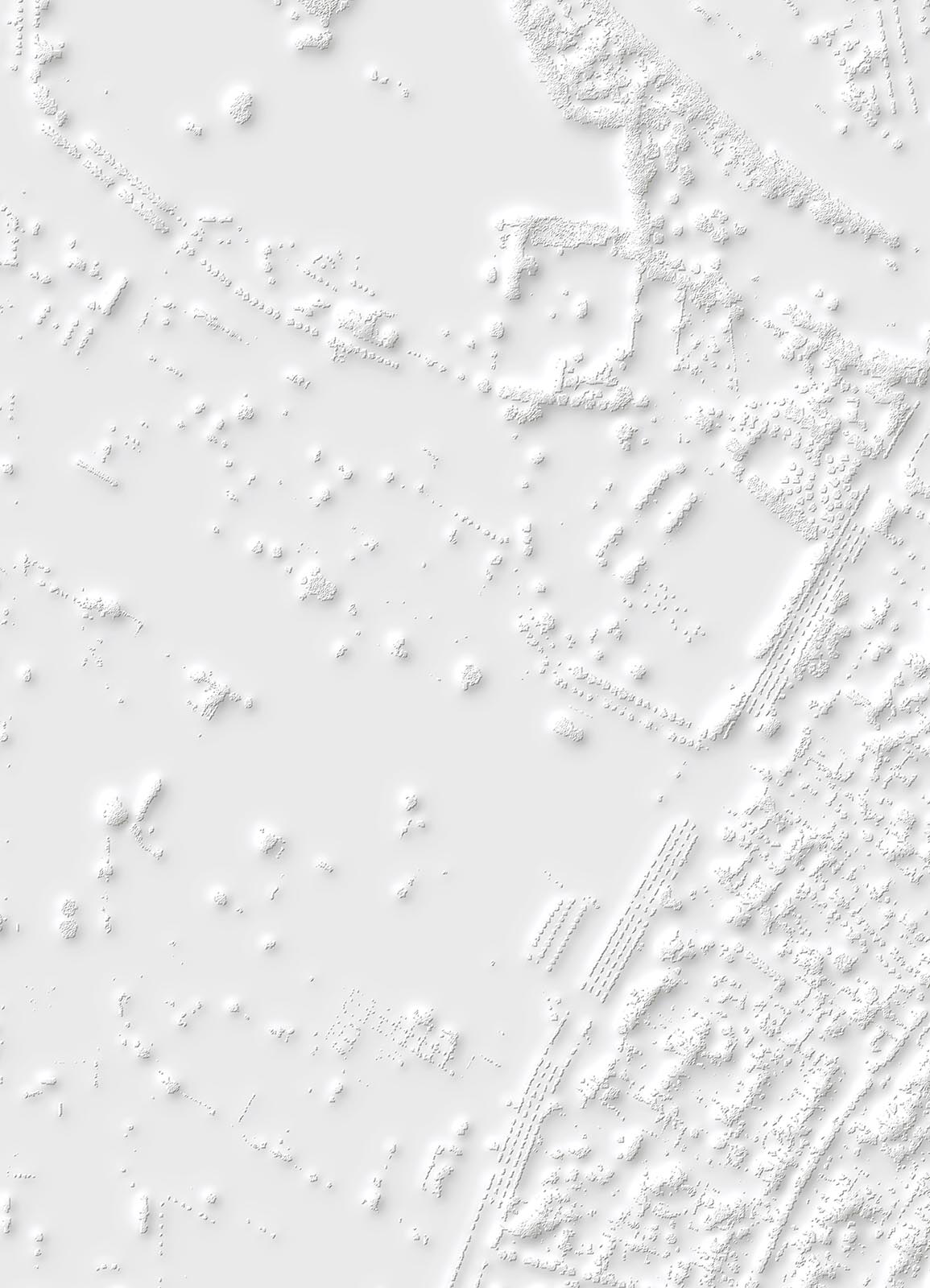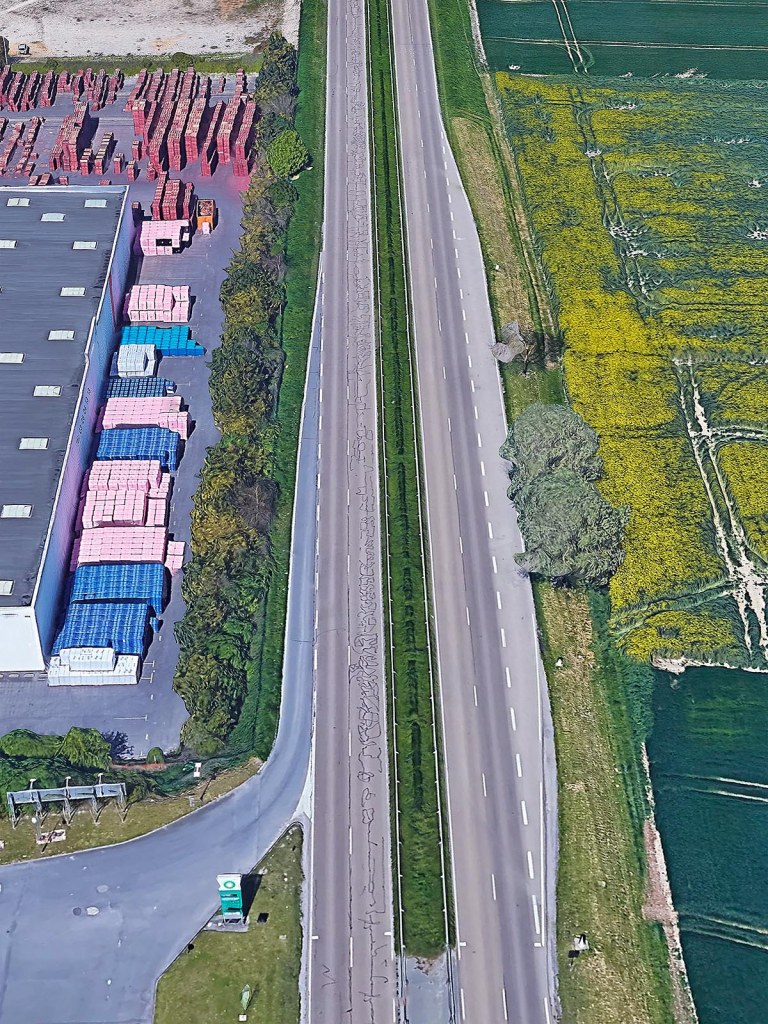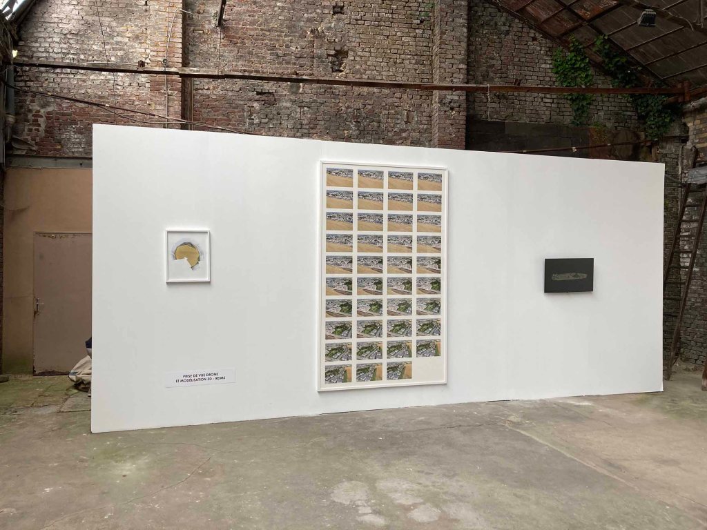 Si la vision verticale des images satellites fournies par le SERTIT apparente ces prises de vue à des cartes, le point de vue oblique offert par Google Earth permet une compréhension d’autant plus juste du territoire que le logiciel ne cesse d’être perfectionné et alimenté par des vues actualisées. Il semble loin le temps où, au début des années 2010, Clement Valla pouvait réaliser sa série Postcards from Google Earth qui, exploitant les failles du système, montrait des paysages en train de fondre et des routes épousant des reliefs incongrus. Certes, les images de Google Earth ne cachent pas leur nature synthétique et les couleurs et surfaces peuvent sembler artificielles. Mais les vraies limites du logiciel tiennent davantage à la couverture inégale des territoires et au traitement différencié de certaines fonctions. Si les zones péri-urbaines qui ont retenu l’attention de Bayol-Thémines sont, à la différence des zones rurales, bien couvertes, l’artiste a pu constater que, depuis l’été 2019, l’usine PSA de Mulhouse, d’abord visible en 3D, fut remplacée par une forêt avant de réapparaître, mais seulement en 2D. S’agissait-il de défauts ou de mesures de confidentialité ? Dans tous les cas, même s’il existe là aussi des restrictions, cette source peut être complétée par l’usage d’un drone. C’est ainsi que Bayol-Thémines a rephotographié avec son drone et modélisé en 3D un quartier de Reims, une zone frontière avec la campagne déjà capturée dans Google Earth.