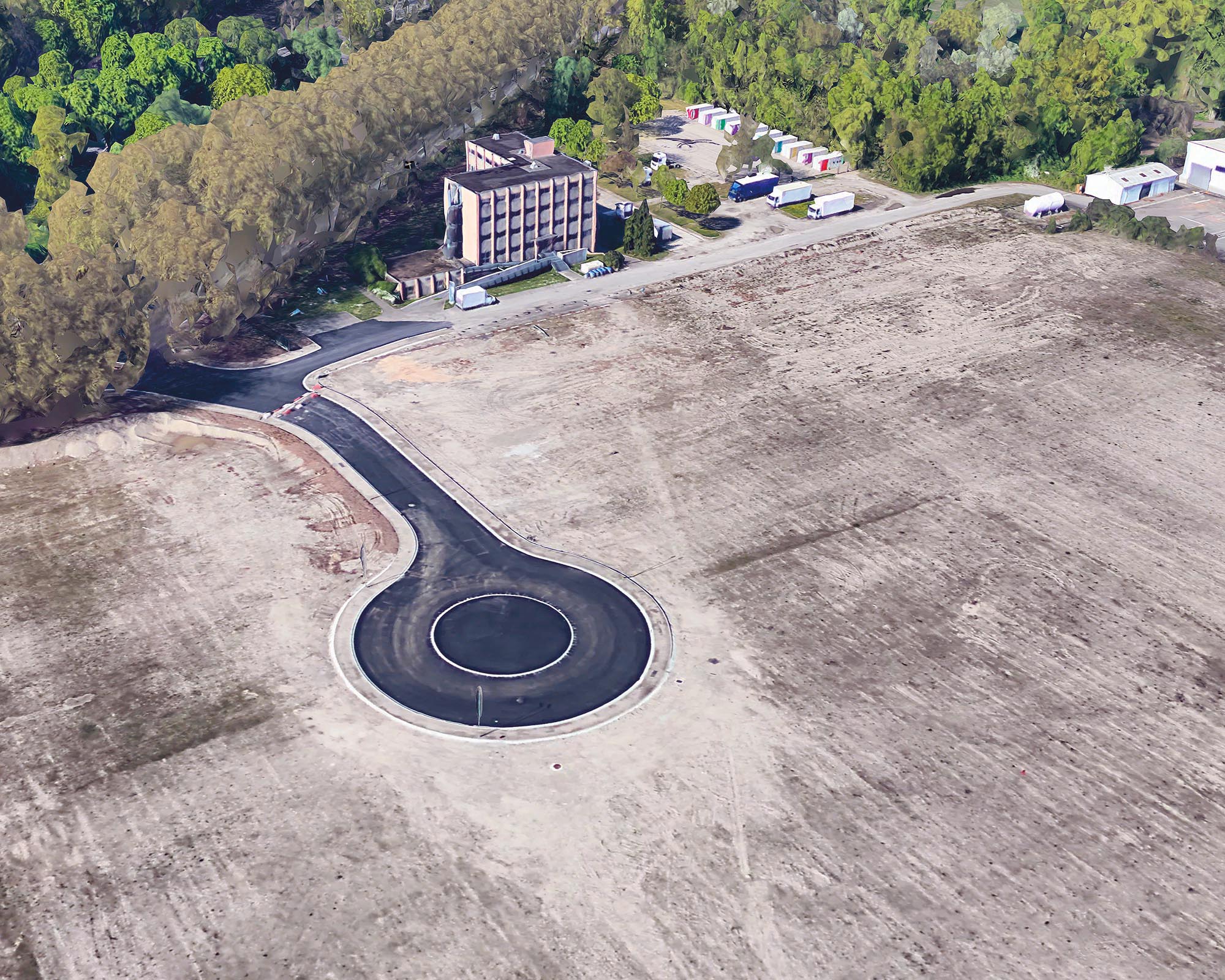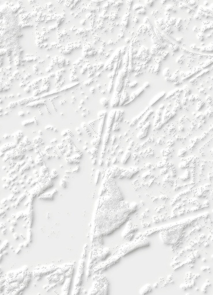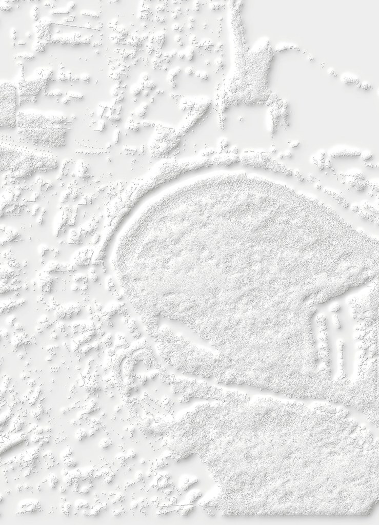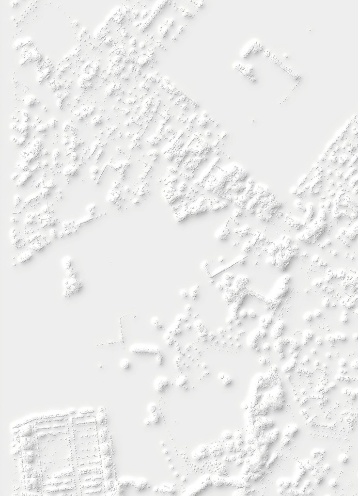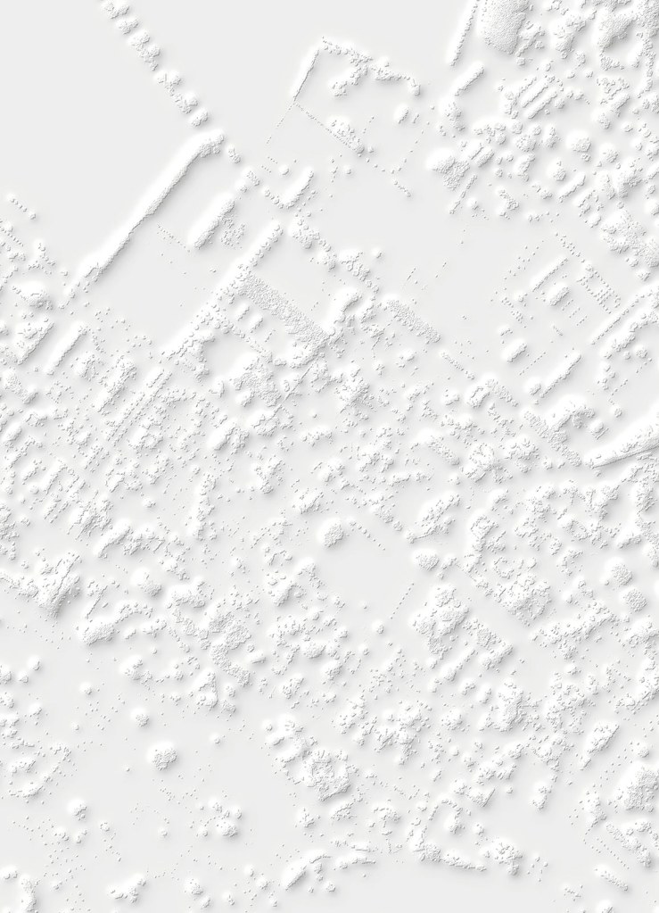 Si la vision verticale des images satellites fournies par le SERTIT apparente ces prises de vue à des cartes, le point de vue oblique offert par Google Earth permet une compréhension d’autant plus juste du territoire que le logiciel ne cesse d’être perfectionné et alimenté par des vues actualisées. Il semble loin le temps où, au début des années 2010, Clement Valla pouvait réaliser sa série Postcards from Google Earth qui, exploitant les failles du système, montrait des paysages en train de fondre et des routes épousant des reliefs incongrus. Certes, les images de Google Earth ne cachent pas leur nature synthétique et les couleurs et surfaces peuvent sembler artificielles. Mais les vraies limites du logiciel tiennent davantage à la couverture inégale des territoires et au traitement différencié de certaines fonctions. Si les zones péri-urbaines qui ont retenu l’attention de Bayol-Thémines sont, à la différence des zones rurales, bien couvertes, l’artiste a pu constater que, depuis l’été 2019, l’usine PSA de Mulhouse, d’abord visible en 3D, fut remplacée par une forêt avant de réapparaître, mais seulement en 2D. S’agissait-il de défauts ou de mesures de confidentialité ? Dans tous les cas, même s’il existe là aussi des restrictions, cette source peut être complétée par l’usage d’un drone. C’est ainsi que Bayol-Thémines a rephotographié avec son drone et modélisé en 3D un quartier de Reims, une zone frontière avec la campagne déjà capturée dans Google Earth.