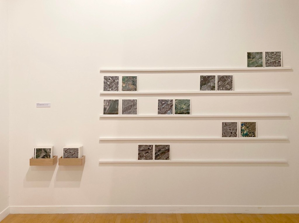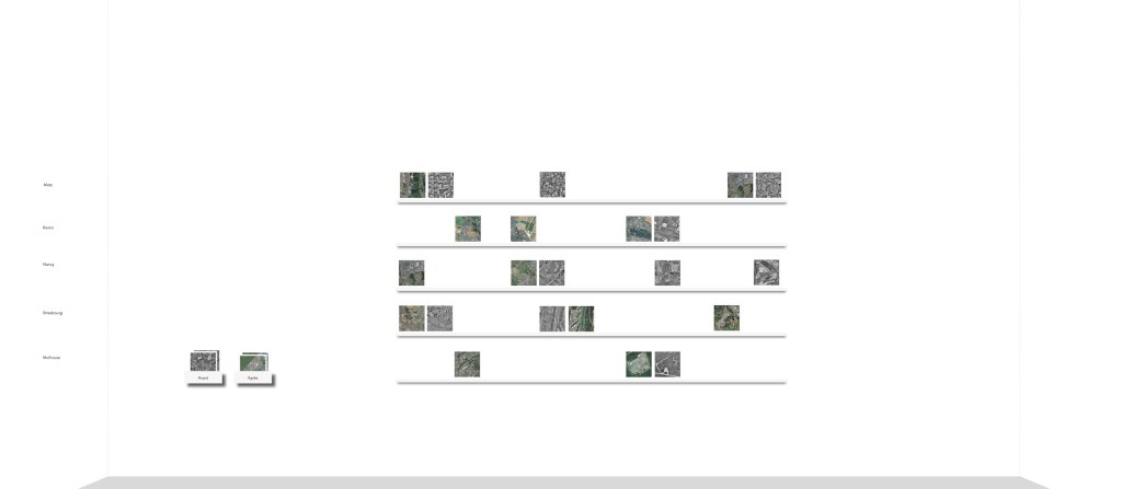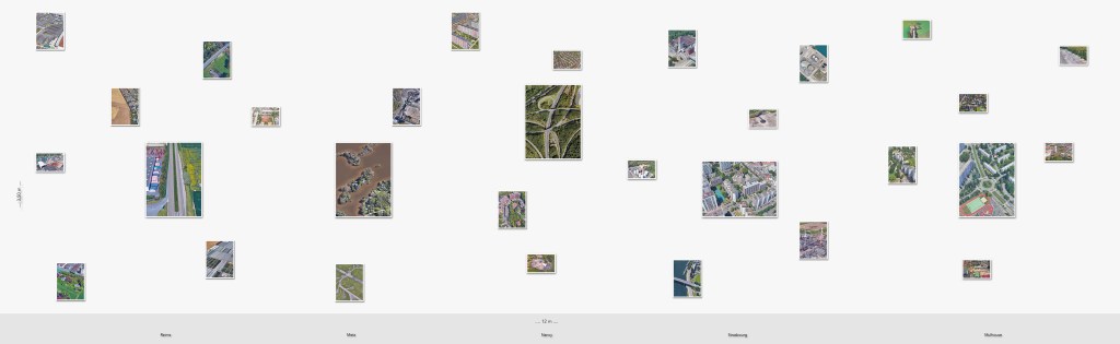 Les images qu’utilise Bayol-Thémines s’opposent terme à terme aux photographies de paysage de plain-pied. Ces dernières sont prises par un opérateur et dictées par un point de vue humain, elles sont le plus souvent frontales et plates et ne donnent, même quand elles composent une série, qu’une vision fragmentaire du territoire. Au contraire, celles convoquées par Bayol-Thémines sont automatisées ou non humaines. Elles sont prises et parfois analysées et modélisées en 3D par des machines et des intelligences artificielles qui suivent des programmes. Aériennes, elles offrent un point de vue oblique ou vertical sur le territoire. Enfin, elles en présentent une vision continue. En effet, l’artiste a aussi extrait des vidéos de Google Earth qui survolent les pourtours de Metz, Mulhouse, Nancy, Reims et Strasbourg, tandis que les images prises par son drone sont organisées en séquences ou, à l’inverse, synthétisées en une seule vue globalisante.