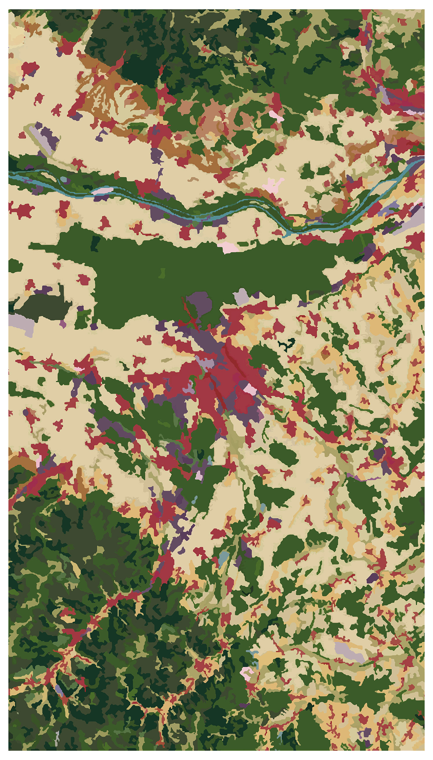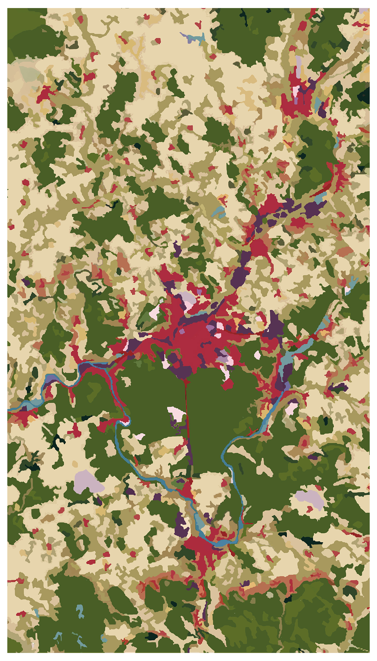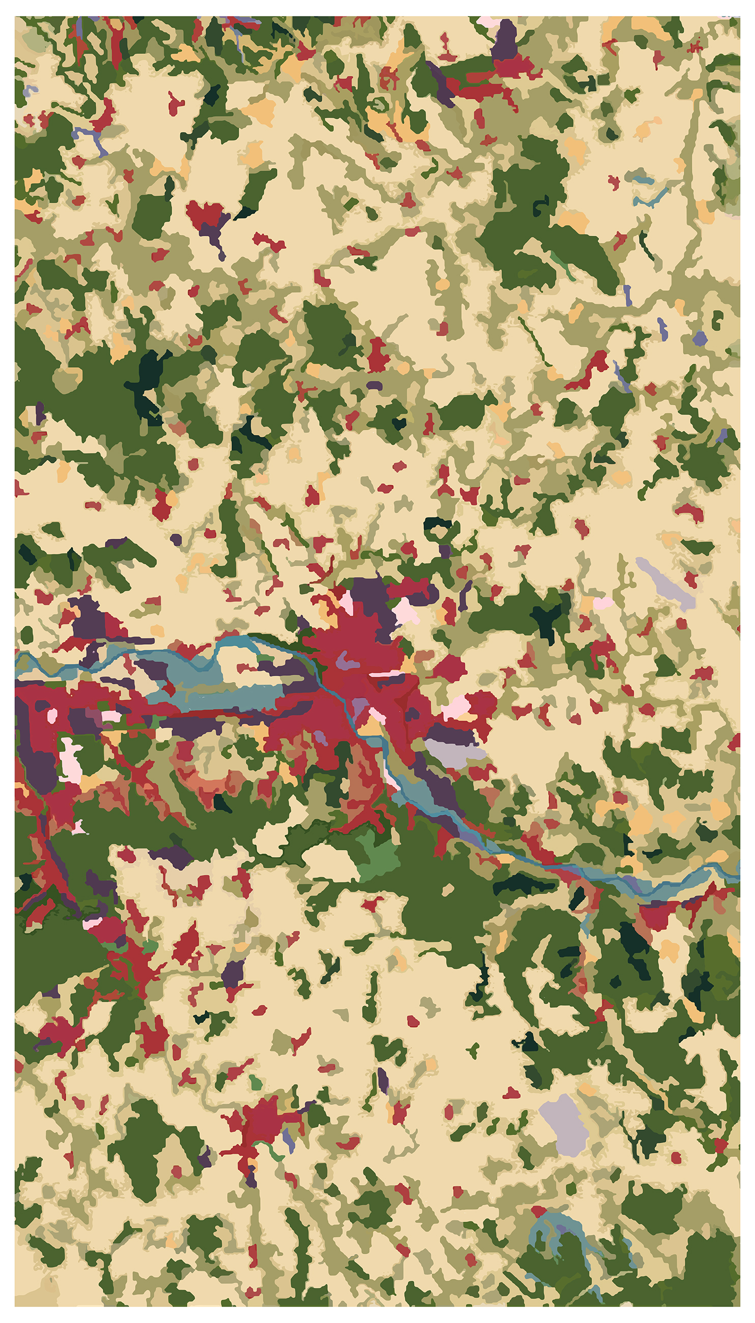 Bayol-Thémines a centré son enquête sur le rapport de l’humain à la nature révélé par l’occupation et l’aménagement de l’espace. Il s’est attaché aux marges des zones habitées et à la présence de la végétation dans la ville. Pour la mener à bien, il a utilisé Google Earth, les images satellites fournies par le Service régional de traitement de l’image et de télédétection (SERTIT) d’Illkirch-Graffenstaden et produit ses propres vues à l’aide d’un drone. Dans le prolongement des pratiques appropriationnistes du 20e siècle qui, à la faveur d’internet, ont connu un regain au 21e, Bayol-Thémines livre telles quelles les images cadrées dans Google Earth du pourtour des villes de Metz, Mulhouse, Nancy, Reims et Strasbourg ou, pour donner des éléments de comparaison historique, retrouve dans Google Earth le cadrage d’anciennes photographies aériennes. Mais il transforme aussi les données fournies par le SERTIT pour élaborer sa propre cartographie des cinq grandes villes du Grand Est ou, de manière encore plus abstraite, faire ressortir la canopée strasbourgeoise.