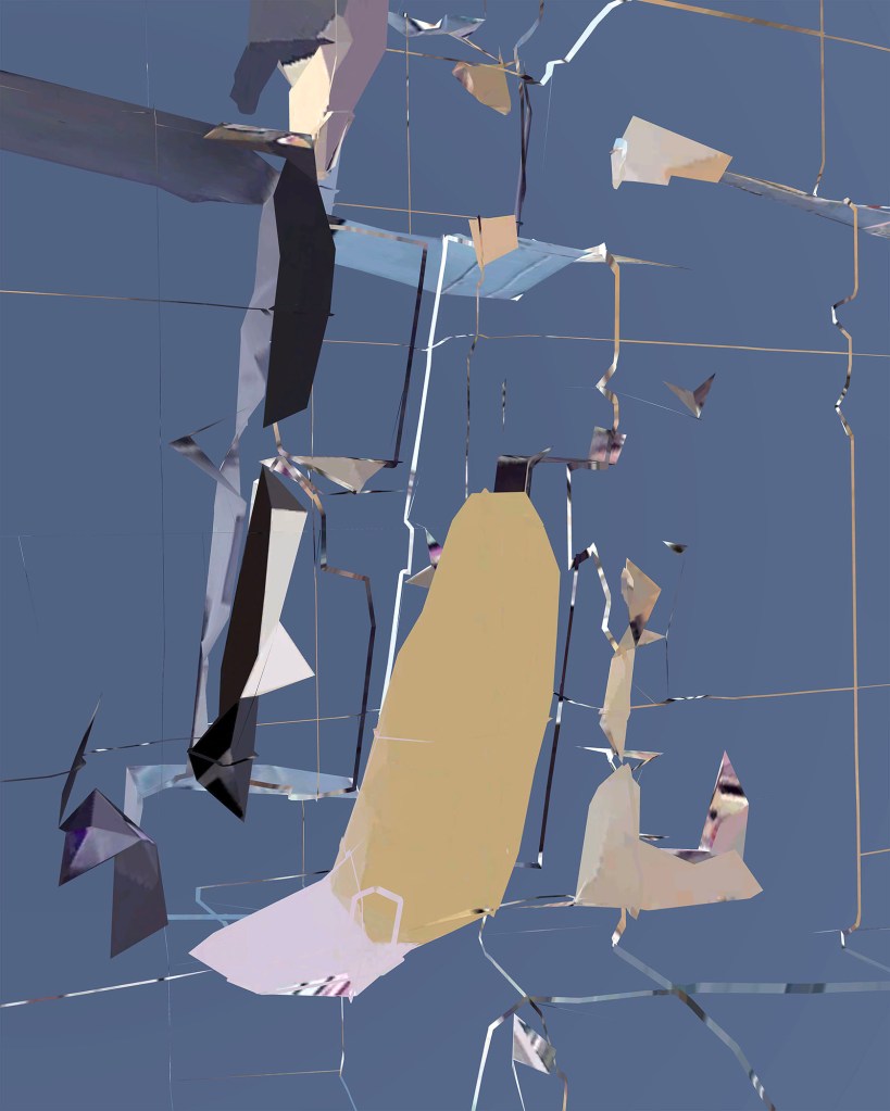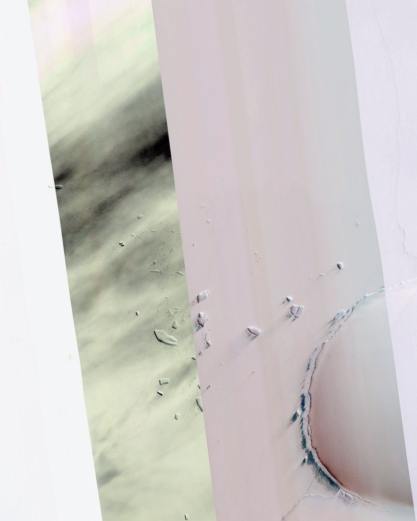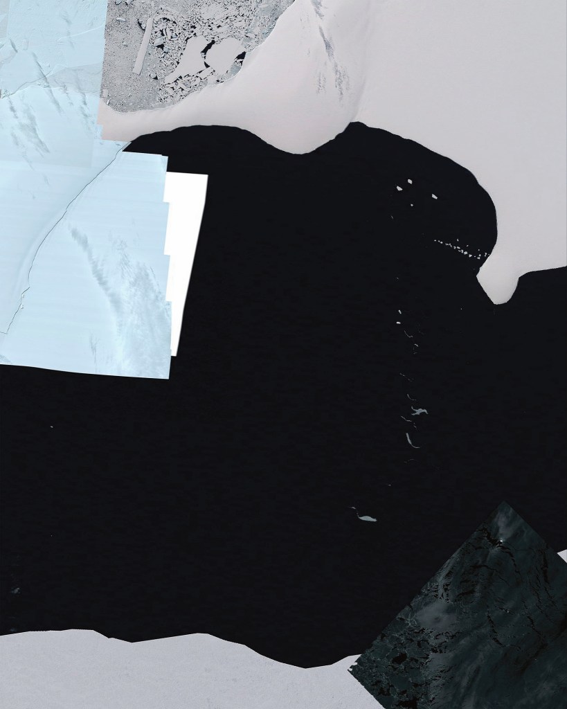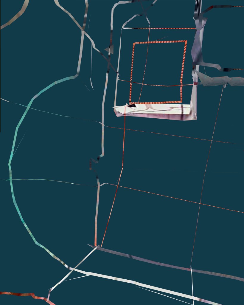 Son protocole Nature est bien plus actif : il consiste, en variant l’approche et l’altitude, à découvrir des zones où le logiciel de représentation bogue, où il ne représente plus le monde (même déformé comme chez Valla), mais une pure abstraction graphique composée de plaques de couleur, de formes angulaires et d’articulations désaxées n’ayant plus aucun rapport avec la réalité. Ces glitches8 de l’algorithme ne sont pas aisément décelables, ils demandent de longues explorations dans les zones de faille possible (comme les pôles), et ils sont éphémères (les programmeurs de Google étant à leur affût et s’empressant de les corriger).
