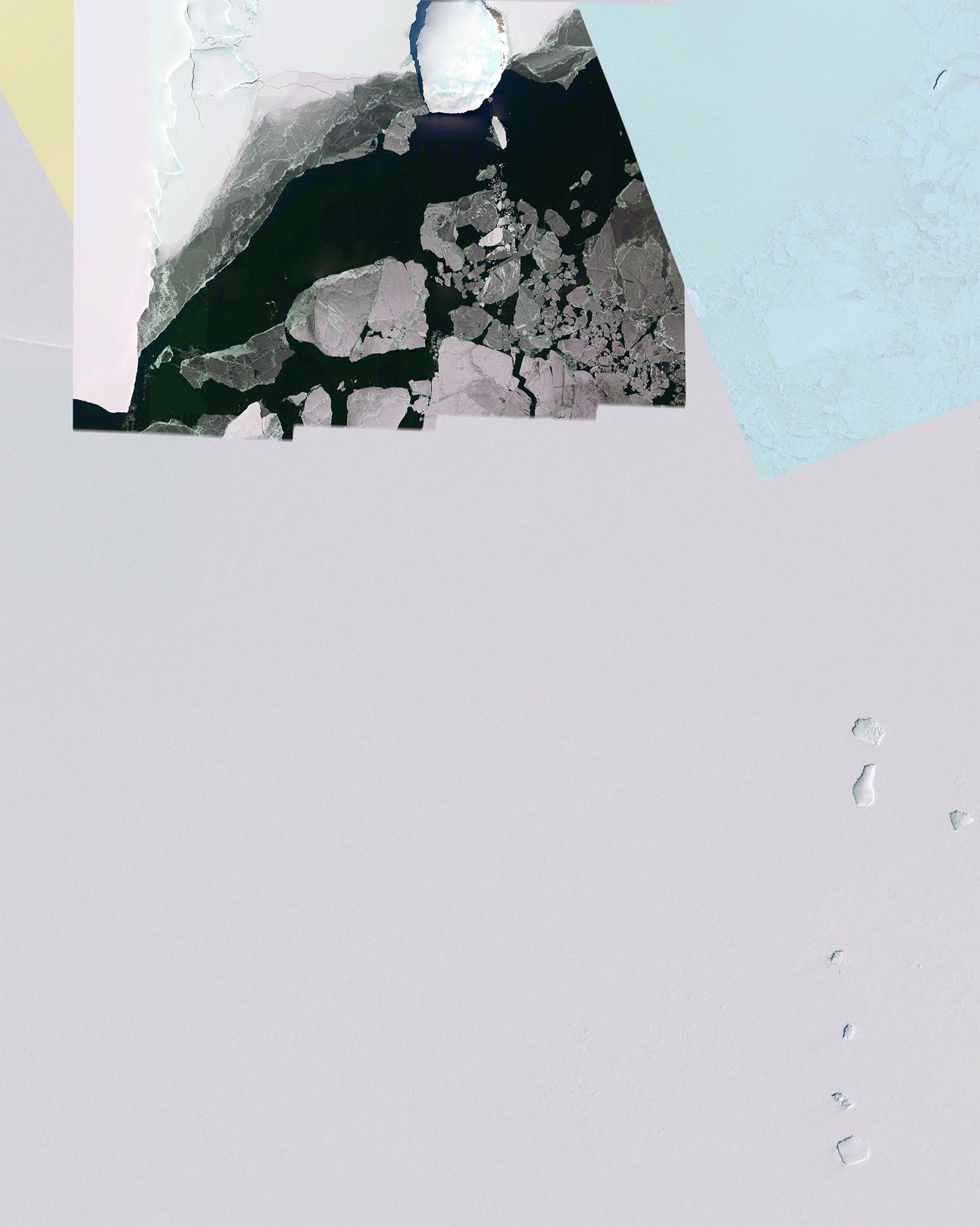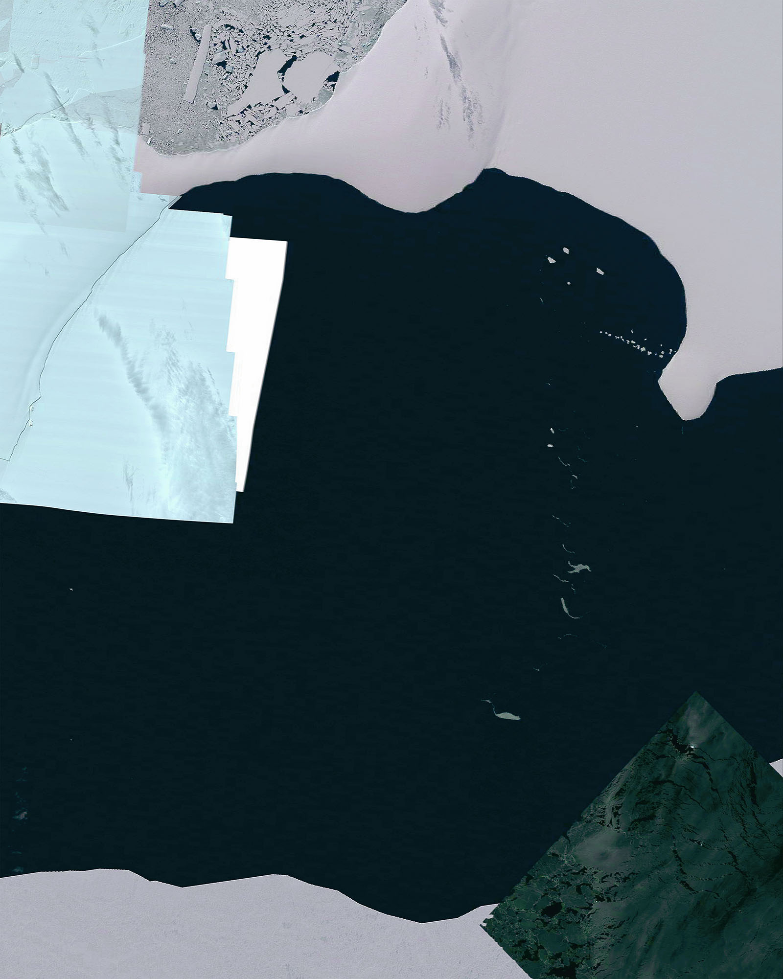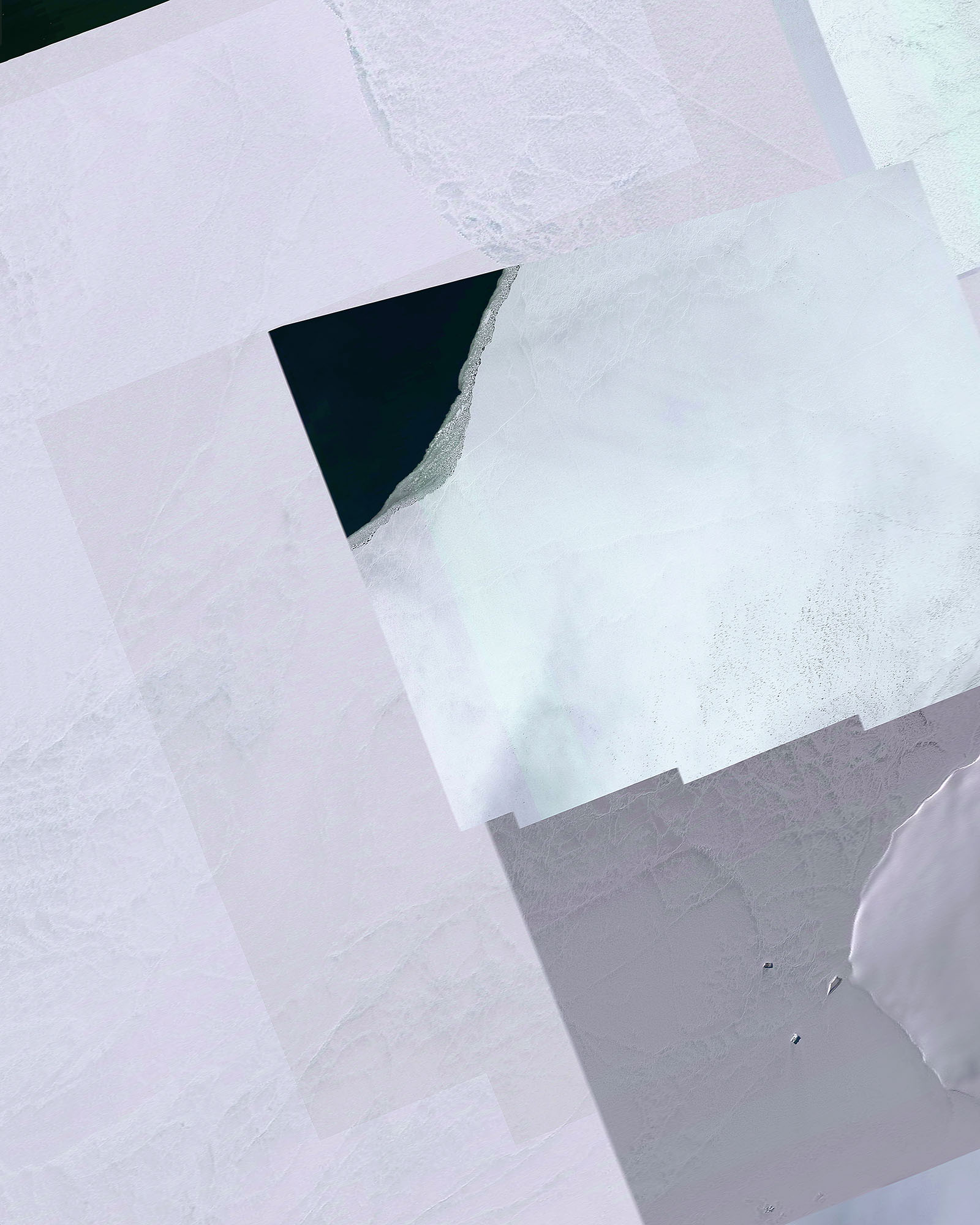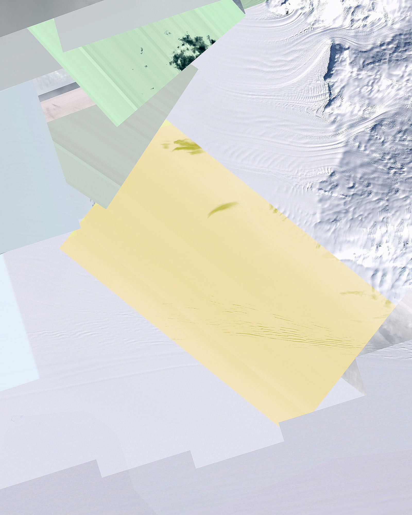 Son protocole Nature est bien plus actif : il consiste, en variant l’approche et l’altitude, à découvrir des zones où le logiciel de représentation bogue, où il ne représente plus le monde (même déformé comme chez Valla), mais une pure abstraction graphique composée de plaques de couleur, de formes angulaires et d’articulations désaxées n’ayant plus aucun rapport avec la réalité. Ces glitches8 de l’algorithme ne sont pas aisément décelables, ils demandent de longues explorations dans les zones de faille possible (comme les pôles), et ils sont éphémères (les programmeurs de Google étant à leur affût et s’empressant de les corriger).