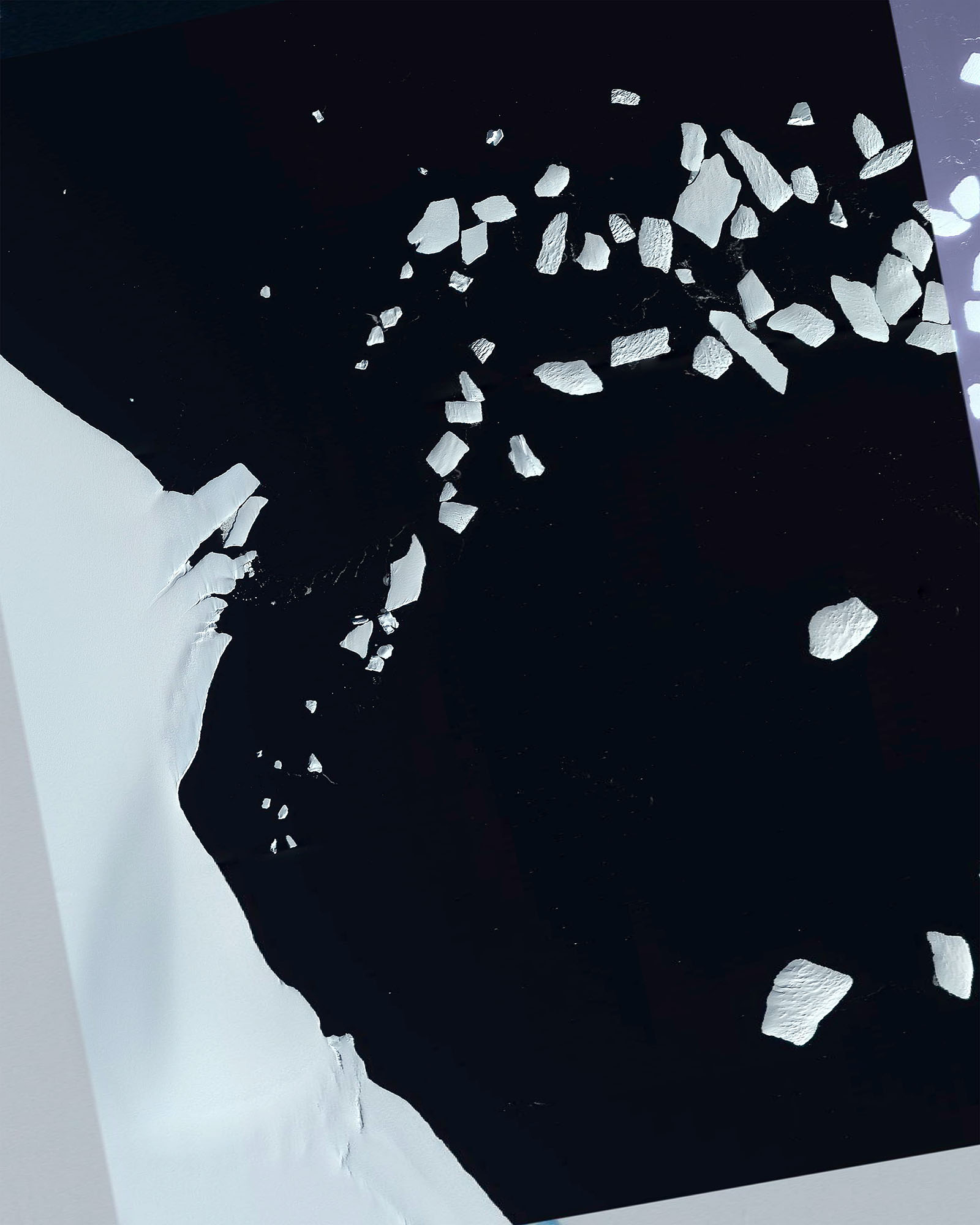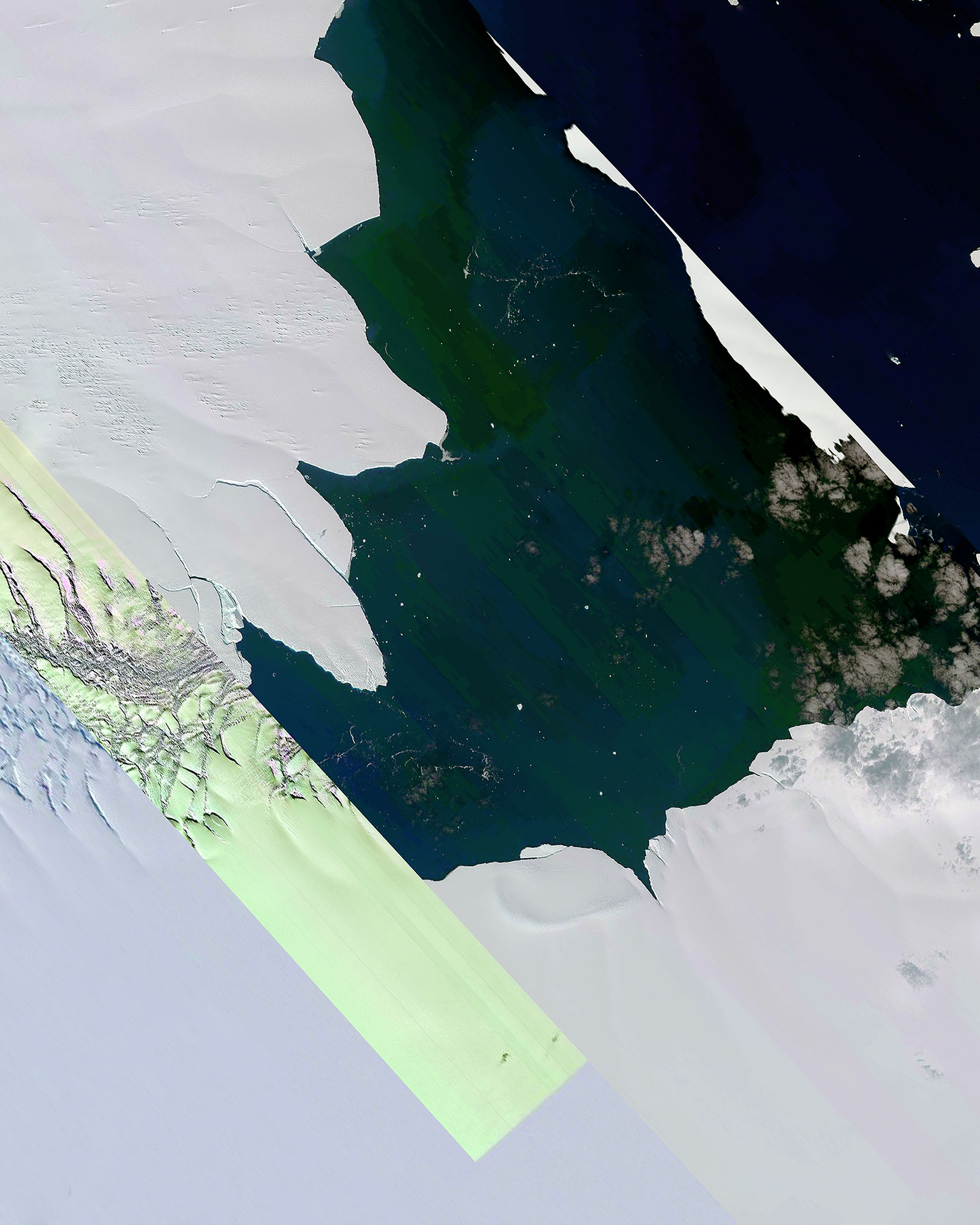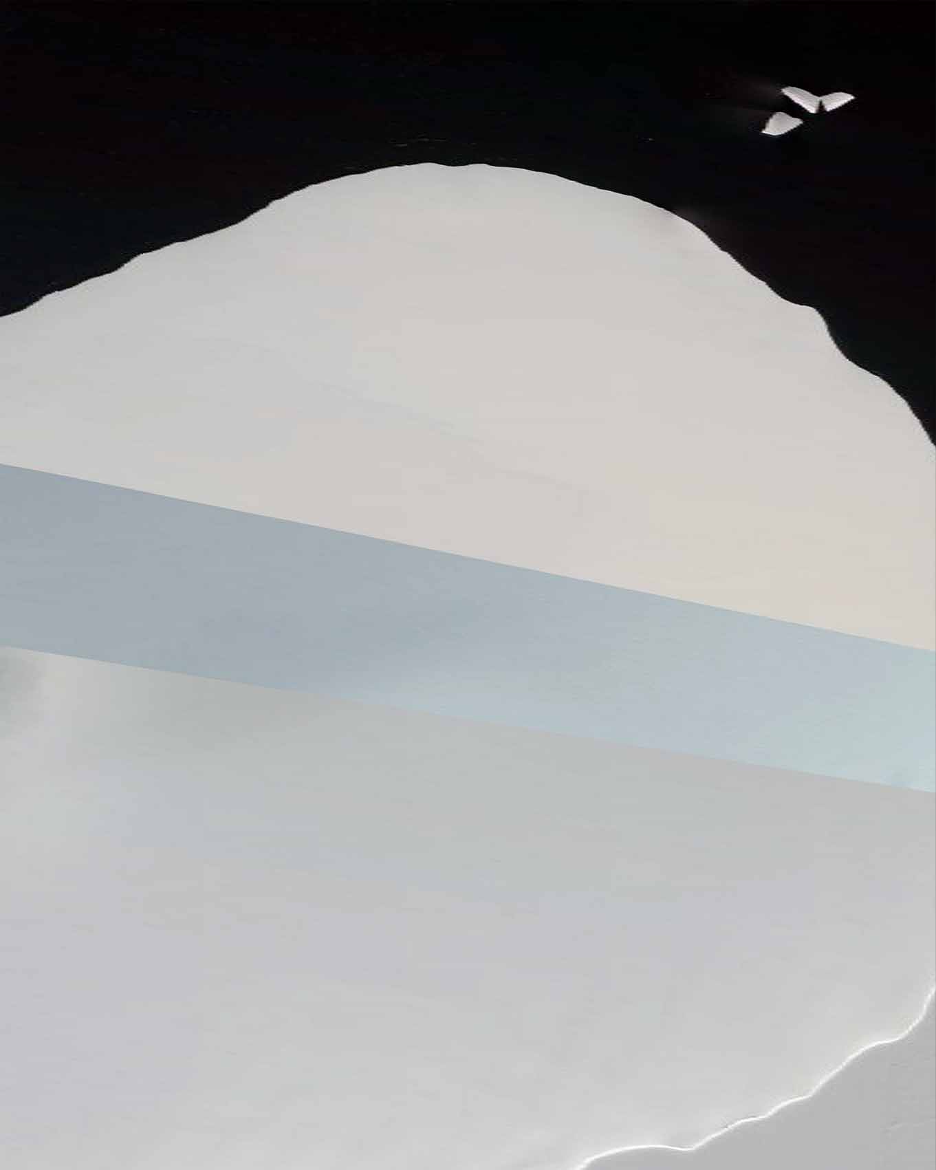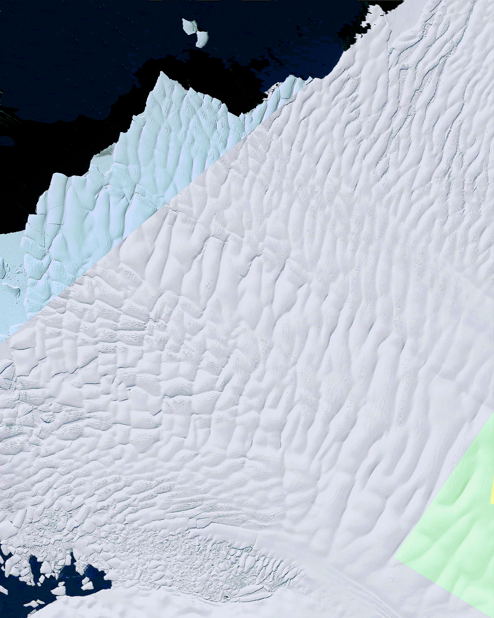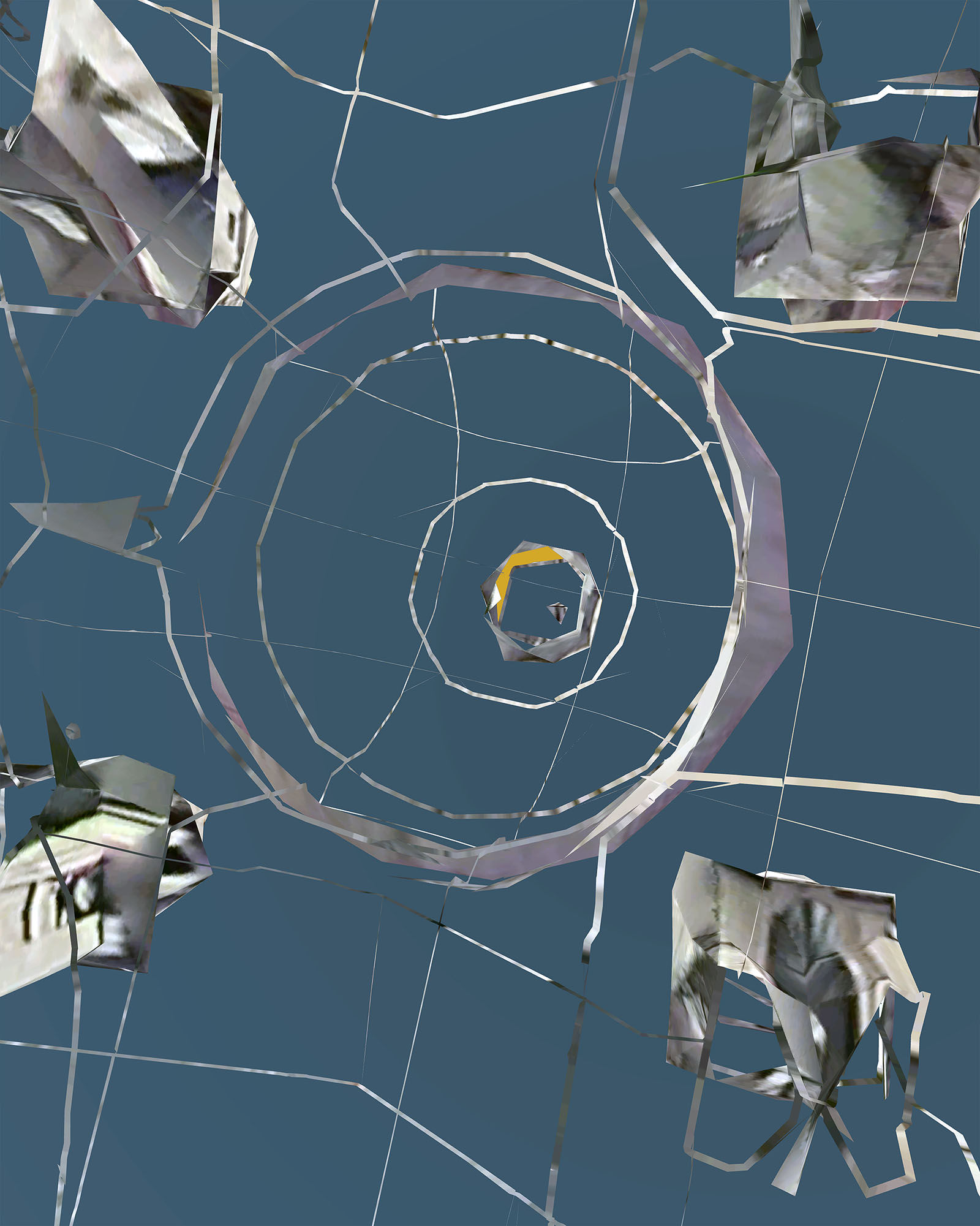 Son protocole Nature est bien plus actif : il consiste, en variant l’approche et l’altitude, à découvrir des zones où le logiciel de représentation bogue, où il ne représente plus le monde (même déformé comme chez Valla), mais une pure abstraction graphique composée de plaques de couleur, de formes angulaires et d’articulations désaxées n’ayant plus aucun rapport avec la réalité. Ces glitches8 de l’algorithme ne sont pas aisément décelables, ils demandent de longues explorations dans les zones de faille possible (comme les pôles), et ils sont éphémères (les programmeurs de Google étant à leur affût et s’empressant de les corriger).