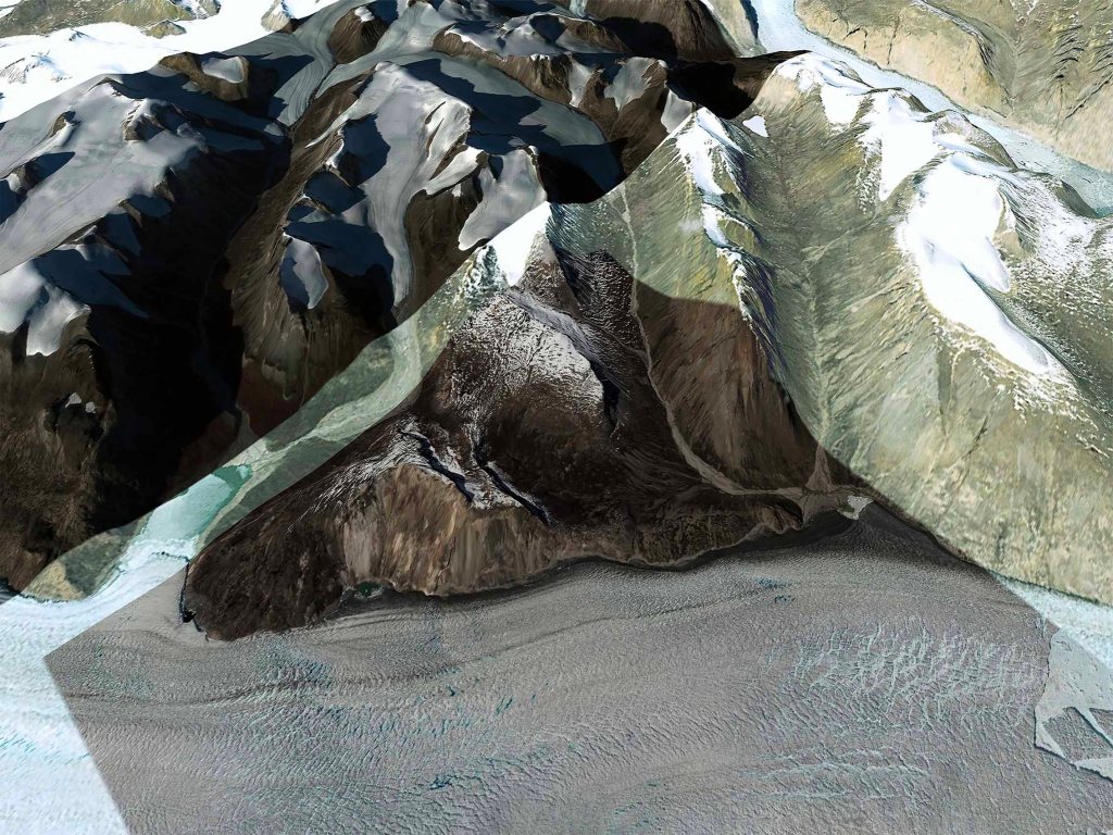 En étudiant ces images, nous pouvons nous apercevoir que les images que propose Google Earth à cet endroit, contiennent de nombreux bugs. Ces territoires, étant de moindre importance l’IA combine des images de différents satellites des années 1990 à 2018 ceci afin de proposer une image du dit espace. Ces Paysages se retrouvent alors composées de différentes résolutions, mais aussi de différentes temporalités. Dans une même image, nous pouvons retrouver associé des images des années 90 à 2018 captées en été, en hiver, des modélisation de jour et de nuit qui dénotent de la captation primaire de ces espaces par un satellite.