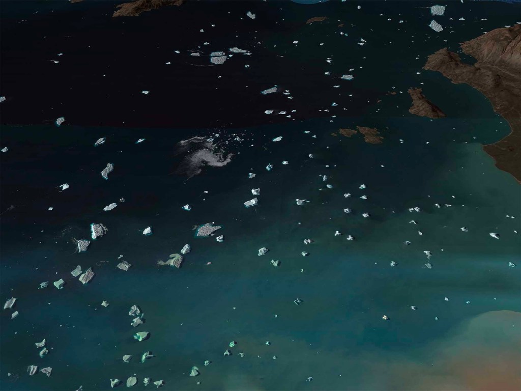 Through this first questioning on the materiality of images and their status, Waters Rising explores the subject of melting ice due to global warming on a geographical area chosen that is the coast of Greenland and questions on the consequences of the rise. waters on the coastal territories of other continents and their endangerment.
