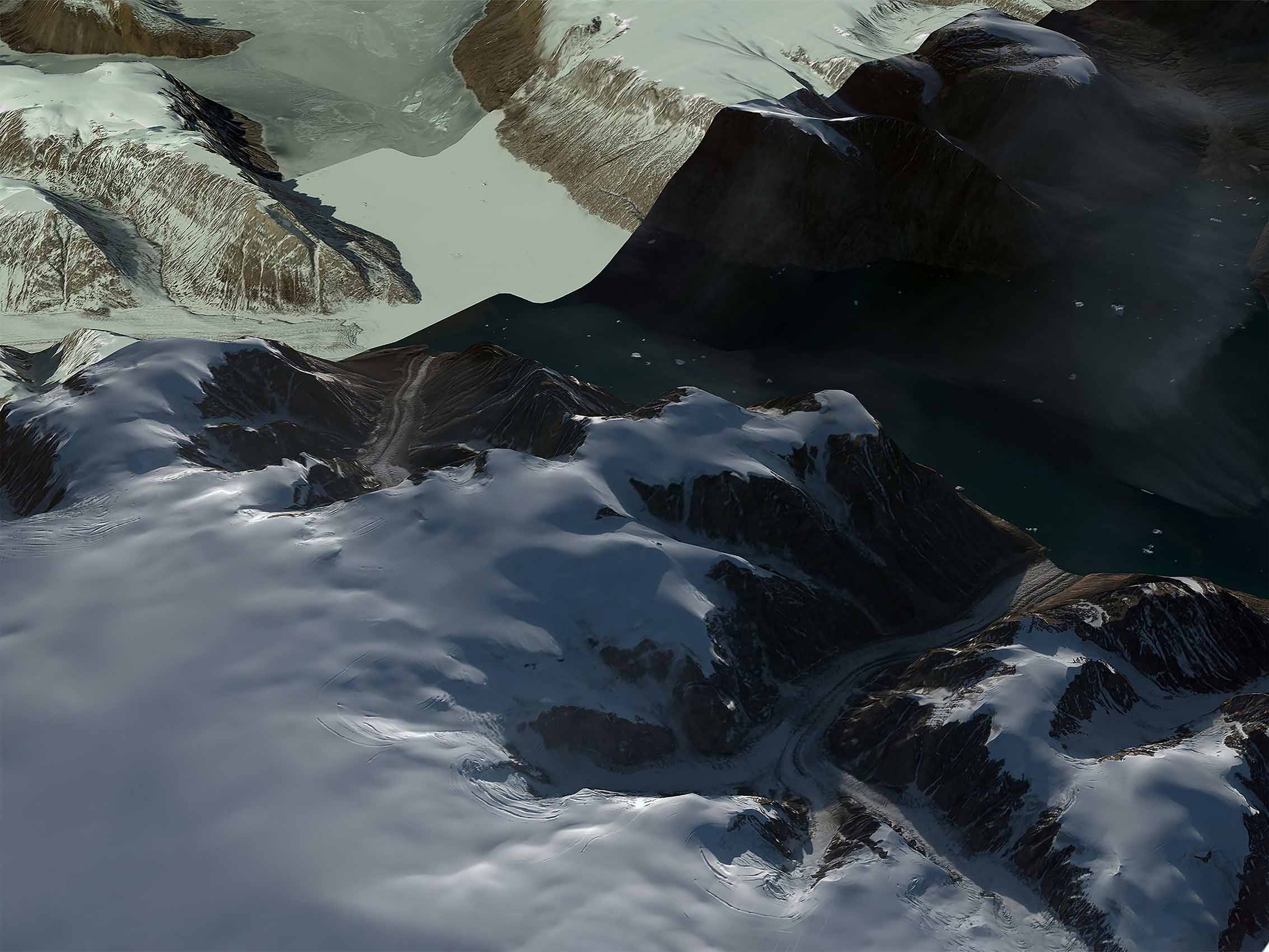 En étudiant ces images, nous pouvons nous apercevoir que les images que propose Google Earth à cet endroit, contiennent de nombreux bugs. Ces territoires, étant de moindre importance l’IA combine des images de différents satellites des années 1990 à 2018 ceci afin de proposer une image du dit espace. Ces Paysages se retrouvent alors composées de différentes résolutions, mais aussi de différentes temporalités. Dans une même image, nous pouvons retrouver associé des images des années 90 à 2018 captées en été, en hiver, des modélisation de jour et de nuit qui dénotent de la captation primaire de ces espaces par un satellite.